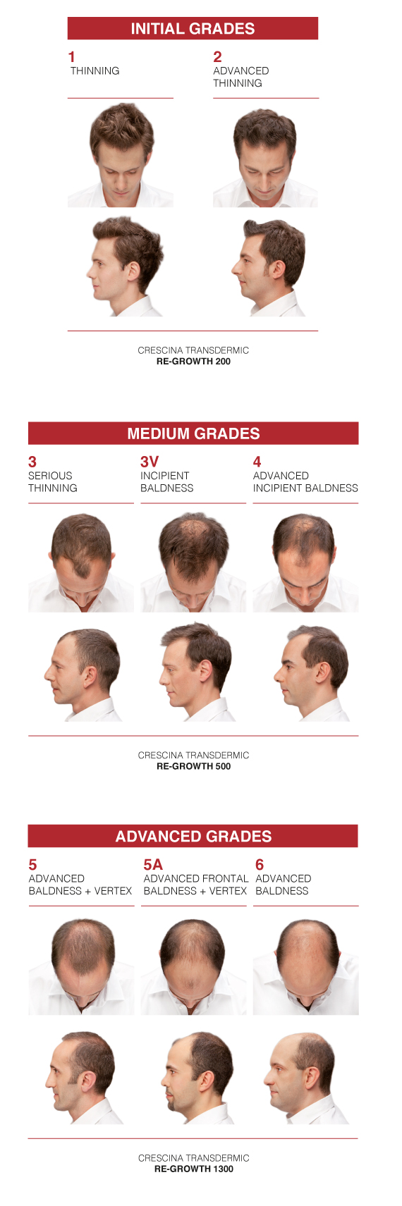 Analizați tabelul de mai jos pentru a identifica nivelul de rărire a părului și dozajul cel mai potrivit.